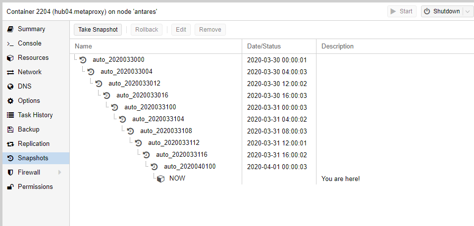 Backups are resource demanding because they put additional load on CPU and storage - differential backups in Proxmox Backup Server help by cutting time required to have machines dumped to backup server significantly but not to the point where we could schedule backups e.g. every hour. It’s not a lost cause though because there is another mechanism - snapshots. Snapshots are an easy and resource-wise way to protect data stored in containers and virtual machines because they just mark points in time